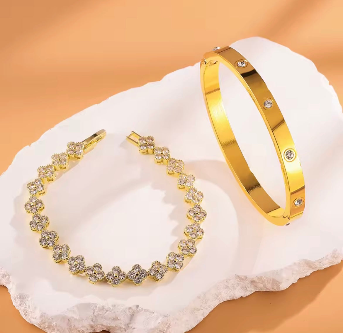 Designed to be worn together or styled separately, this set delivers effortless sophistication—whether you’re elevating a casual look or adding polish to an evening outfit. The contrast between the smooth bangle and the sparkling clover design creates a timeless, high-end aesthetic that never goes out of style.
